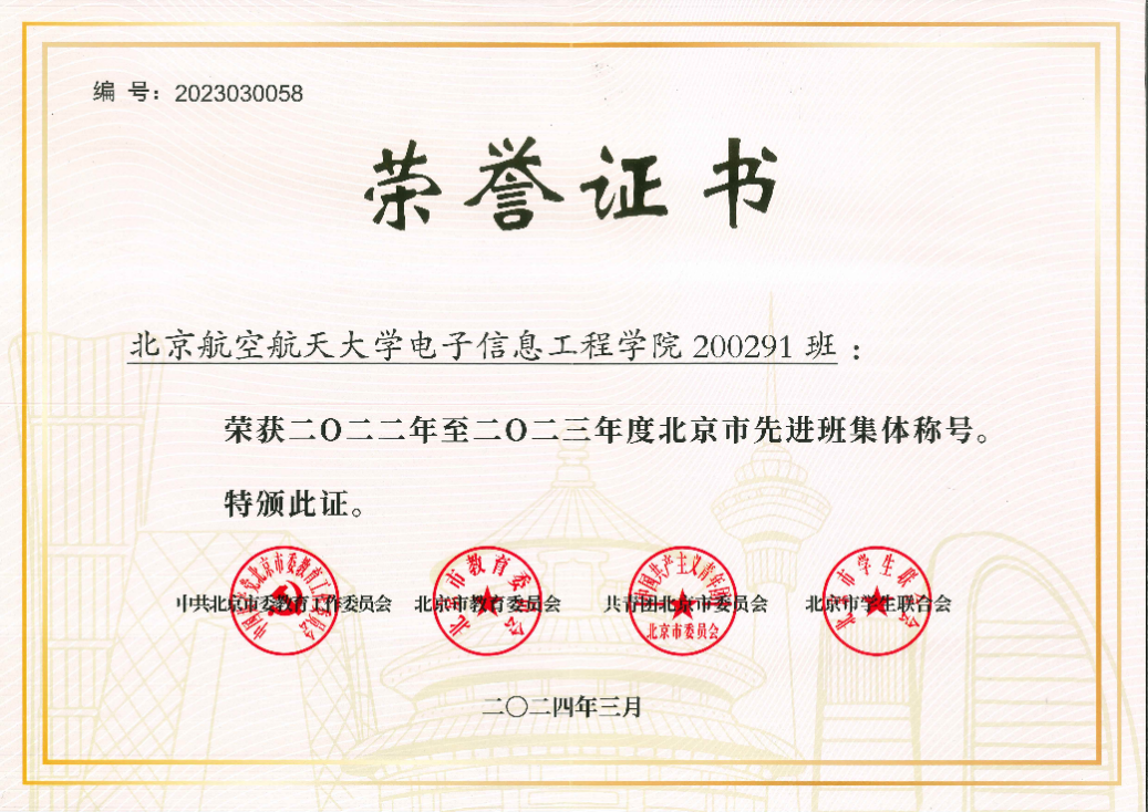 2名研究生获“沈元奖章”,2人获北航五四奖章,1人获北航“研究生十佳”,1人获北航“十佳志愿者”,3人获北航优秀学生兼职辅导员奖学金特等奖,科创竞赛中共获得省部级一等奖及以上奖项13项。2020级本科生王治强参军入伍。210231班获北京市“先进班集体”、北航“十佳班集体”。裸聊app