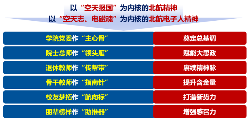 在学校实施大思政课“一院一品计划”的支持下,以“空天志、电磁魂”为精神内核,统筹用好思政课程与课程思政、课上与课下、校内与校外、网上与网下等各类育人资源,凝练出讲方法、有特色、有成效的“六位一体”大思政育人体系,全力推动思想政治工作高质量内涵式发展。