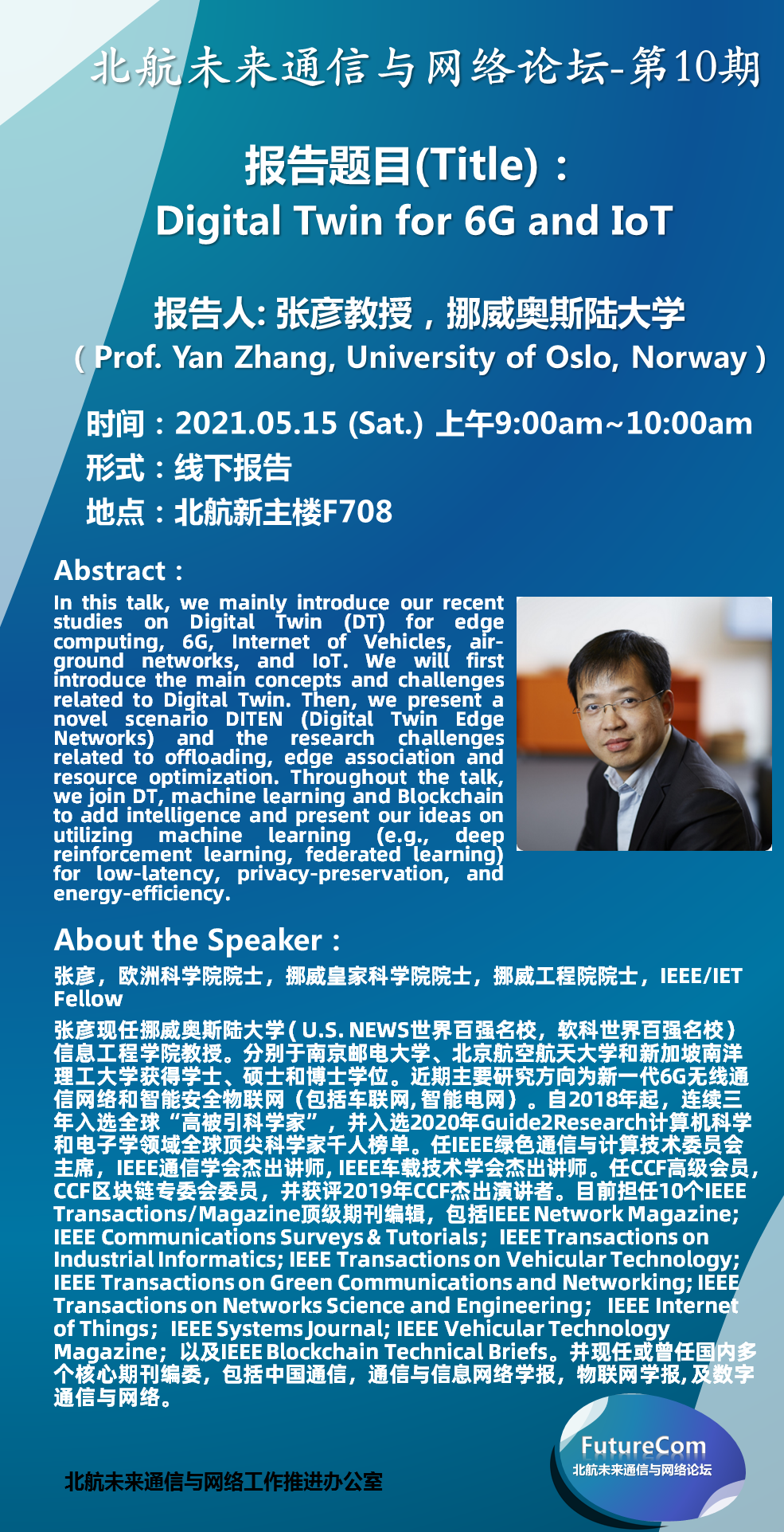 报告摘要:In this talk, we mainly introduce our recent studies on Digital Twin (DT) for edge computing, 6G, Internet of Vehicles, air-ground networks, and IoT. We will first introduce the main concepts and challenges related to Digital Twin. Then, we present a novel scenario DITEN (Digital Twin Edge Networks) and the research challenges related to offloading, edge association and resource optimization. Throughout the talk, we join DT, machine learning and Blockchain to add intelligence and present our ideas on utilizing machine learning (e.g., deep reinforcement learning, federated learning) for low-latency, privacy-preservation, and energy-efficiency.
